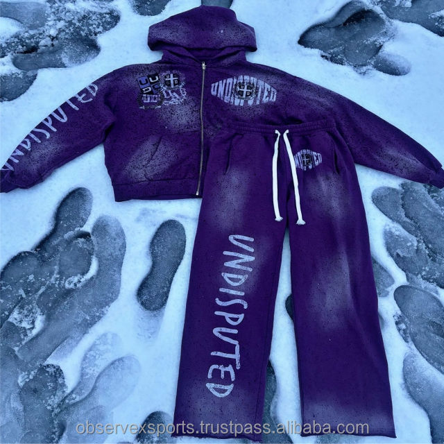 Survêtement d'hiver épais en coton 100% respirant et à séchage rapide, délavé à l'acide, effet usé, avec patch brodé, style streetwear, coupe évasée