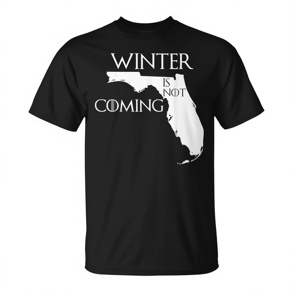 T-shirt unisexe noir pour adulte, col rond, manches courtes, imprimé en sérigraphie, avec la phrase « Winter Is Not Coming Florida »