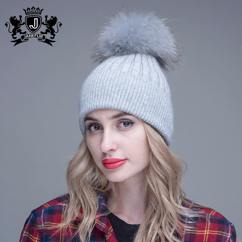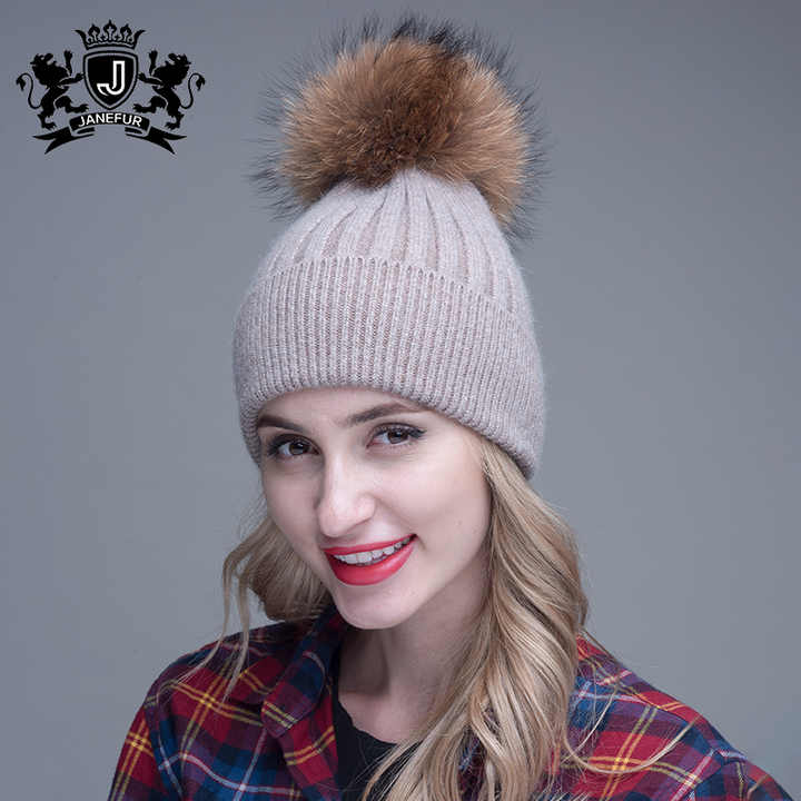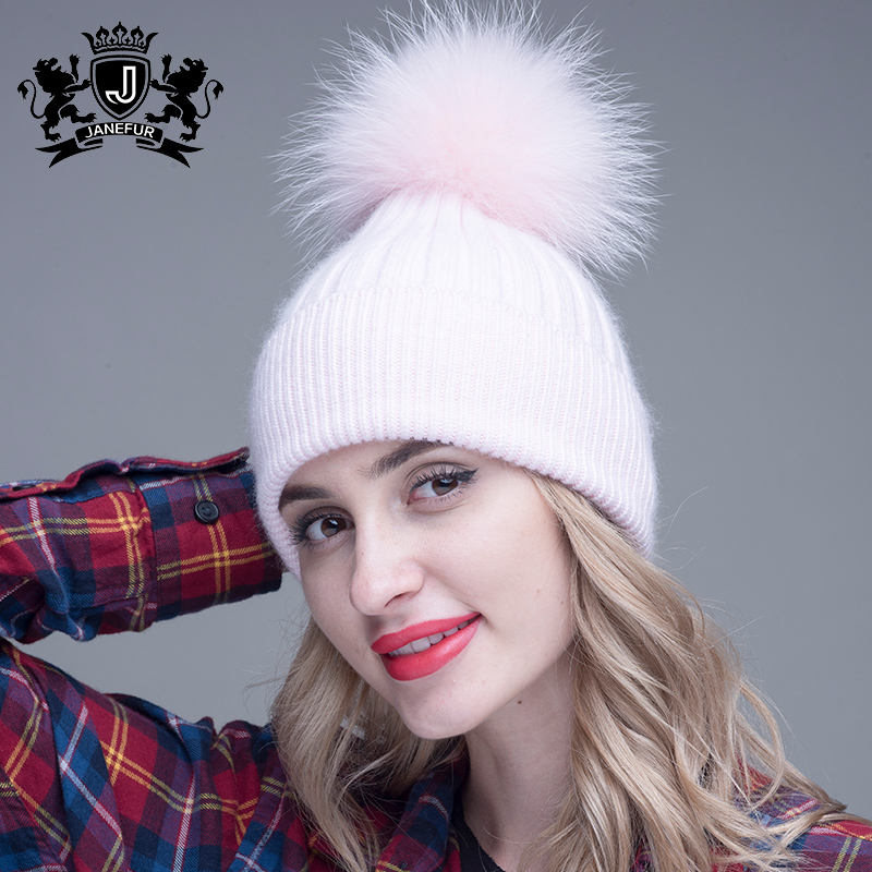 Bonnet d'hiver en tricot de marque Bonnet doux avec grande boule de fourrure Bonnet en fourrure de raton laveur Pom Pom Angora Bonnet en laine