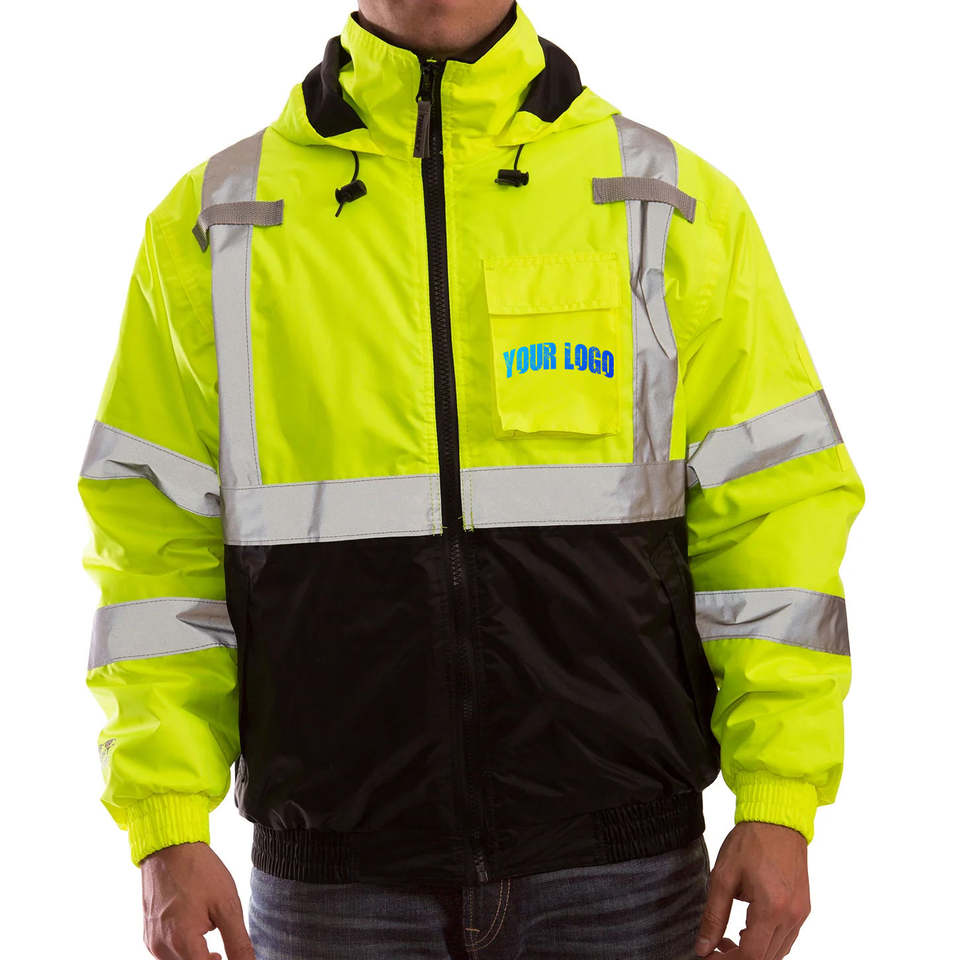 Veste d'hiver coupe-vent d'extérieur avec bandes réfléchissantes, logo personnalisé, veste à capuche en peluche et épaisse