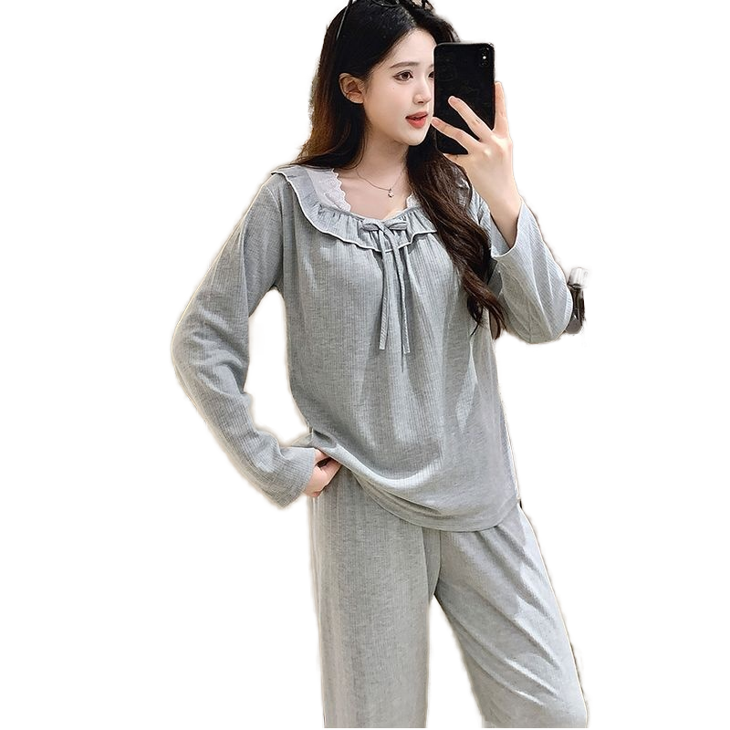 Winter Spring Autumn Sweet Princess Style Long Sleeve Elastic Waist Pajamas Korean Lace Trim Nightshirts Casual Minimalist Home