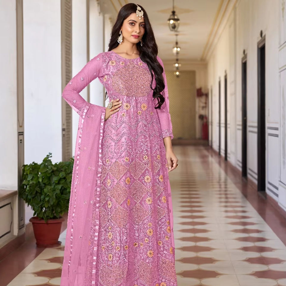 Filet à papillons Salwar Kameez avec ornements élégants et détails en satin japonais.