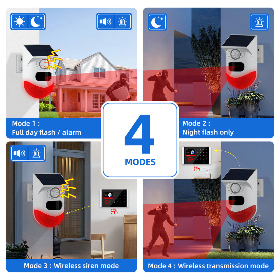 Alarme solaire sans fil 433MHZ avec détecteur de mouvement Sirène de sécurité extérieure 120dB Son fort Alarme solaire pour la faune sauvage