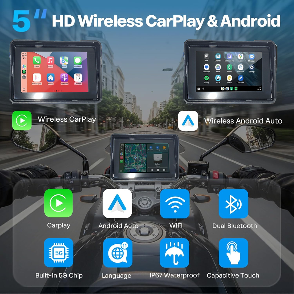 Sans fil Android Auto Y Carplay Pantalla Para Moto Accesorios Per Con Pour Gps Senza Fili 5 Pouces Pulgadas Mirror Link