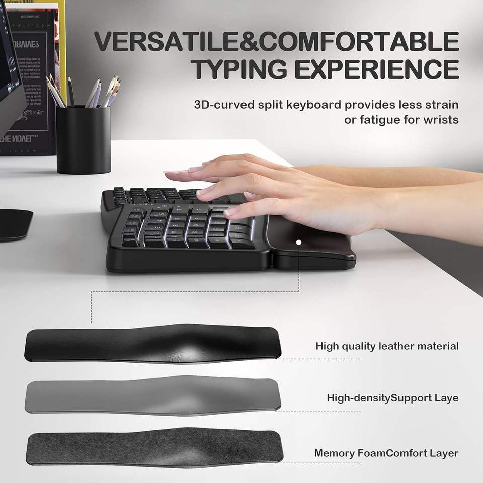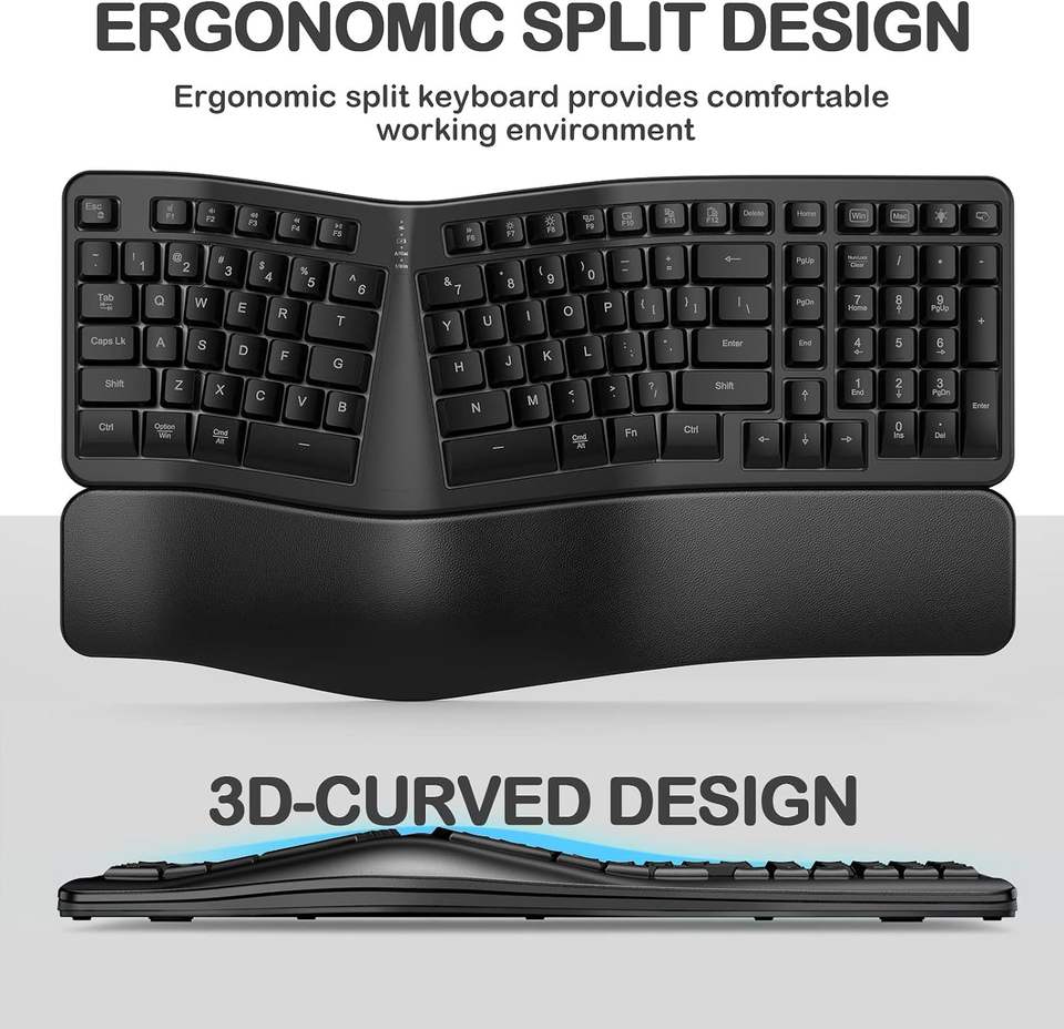 Clavier ergonomique sans fil rétroéclairé avec repose-poignets et frappe confortable, 104 touches, 10 raccourcis pour Mac et ordinateur portable PC