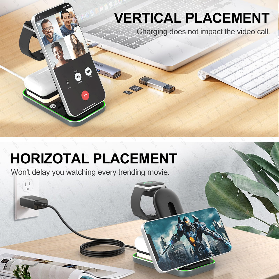 Station de charge sans fil 4 en 1 Chargeur sans fil pour iPhone 16 15 Max/X/8 15W Station de charge rapide sans fil pour IWatch Ultra