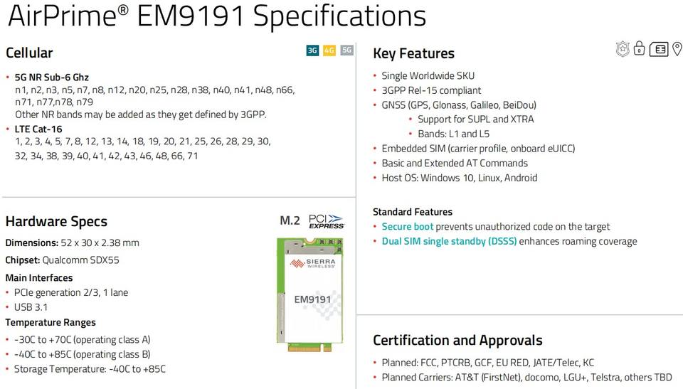 Modem Internet sans fil - Module IoT 5G - Sierra EM9191 5G NR Sub-6 GHz