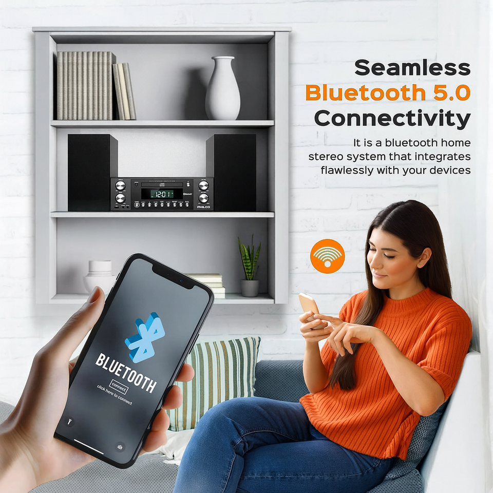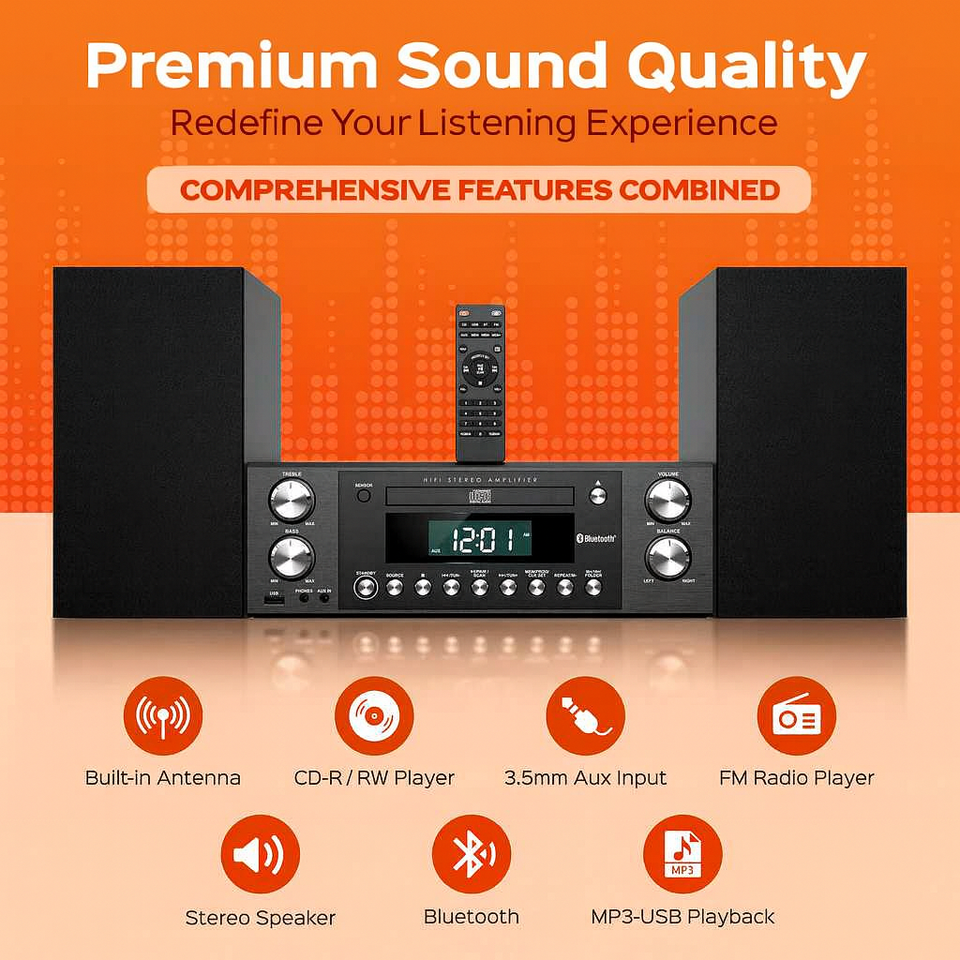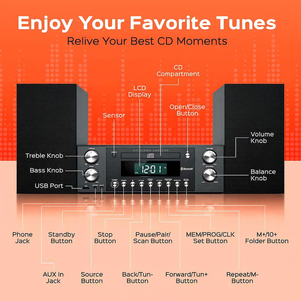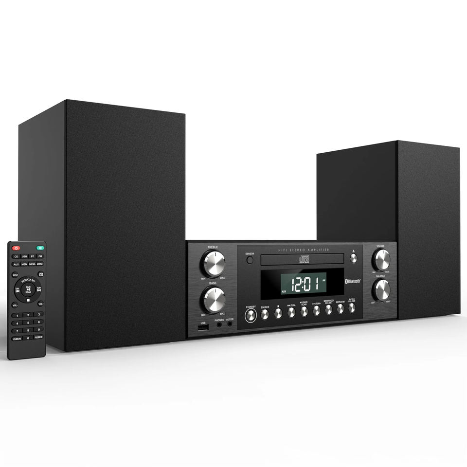 Système stéréo avec radio FM Bluetooth, lecteur USB/CD, haut-parleur puissant 50W avec contrôle des basses/aigus