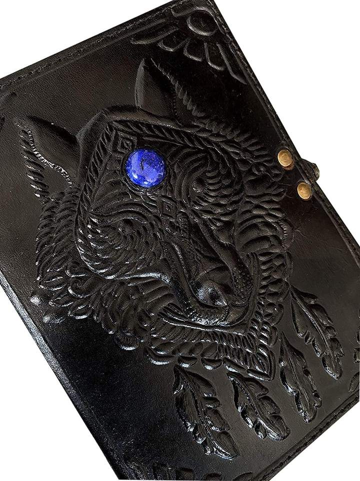 Carnet de notes A3 de luxe Wolf Design Logo personnalisé imprimé Pierre unique Cuir noir souple Couverture rigide Selle Couture Organisateur