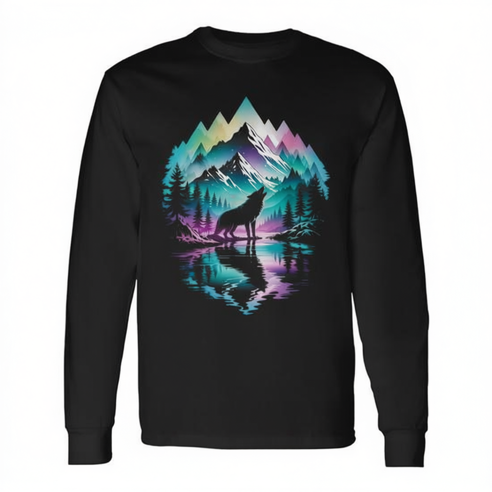 T-shirt à manches longues avec image graphique Wolf Forest Moon Cosmic Howling Wolf Lover