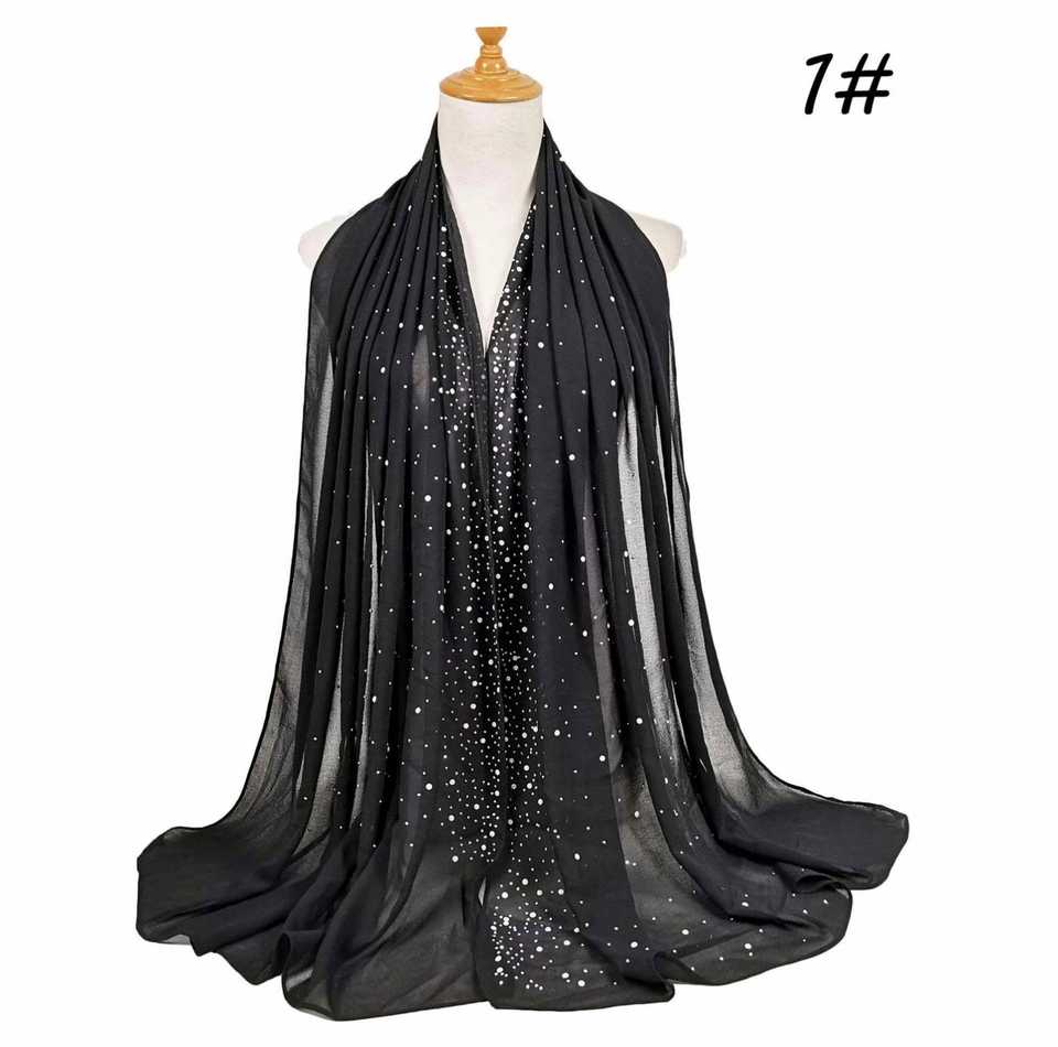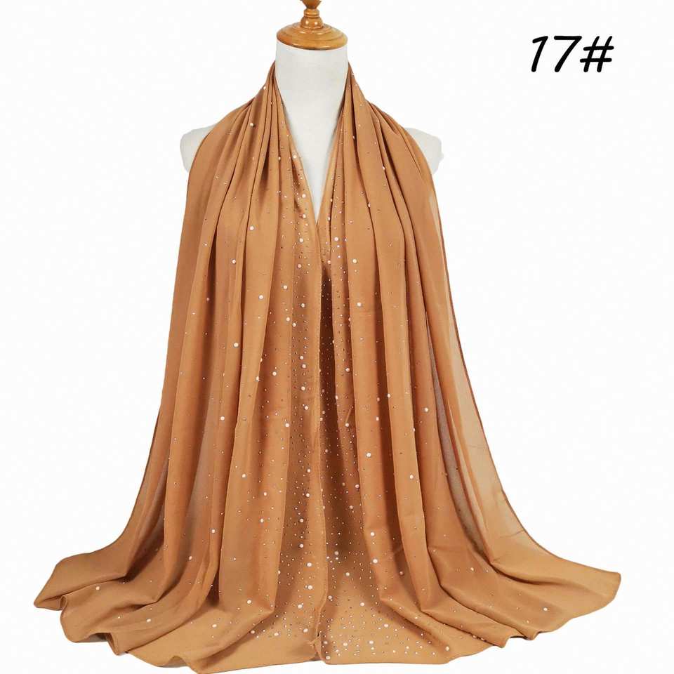Foulard en mousseline de soie uni pour femme, orné de strass et de perles, style musulman tendance