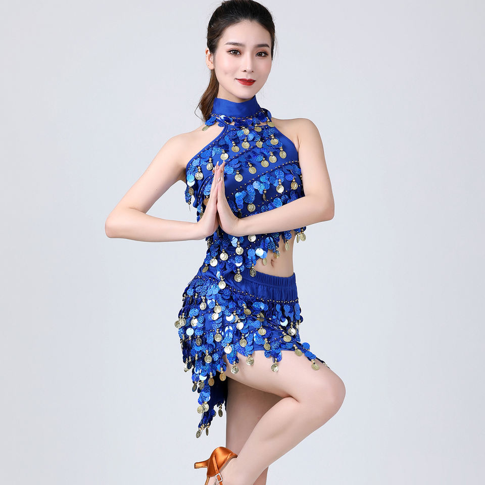 Femmes 3 Pcs Set Fringe Round Disc Sequins Costume Latin Dance Outfits Sleeveless Lace-up Tank Top Mini Skirt with Shiny Choker