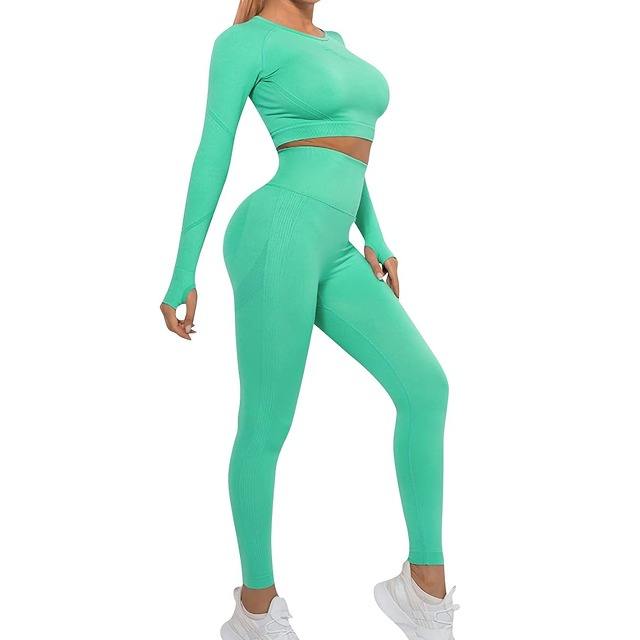 Ensemble 2 pièces de yoga et d'entraînement pour femme, matière légère et extensible, motif uni, logo frontal, longueur cheville, taille haute élastique