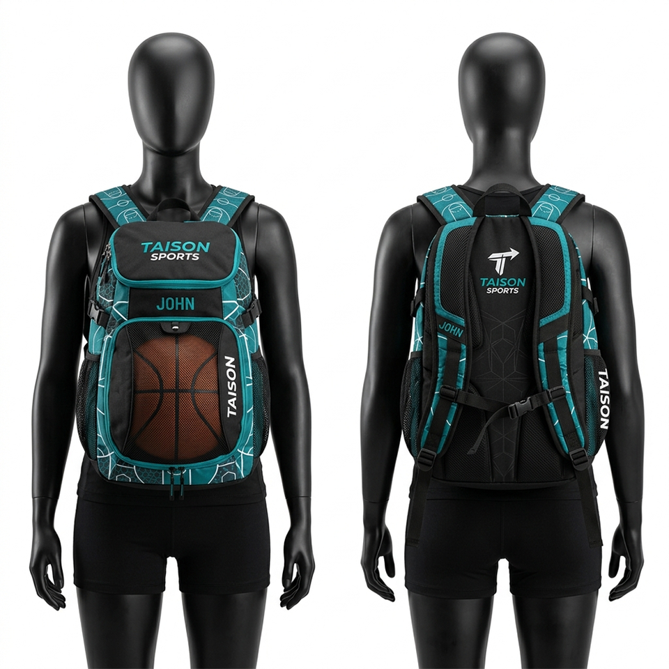 Sac à dos de sport pour femmes, basketball, polyester 300D, 220 GSM, design à panneaux bleu-vert et violet, broderie, impression, logo personnalisé, sac de sport durable