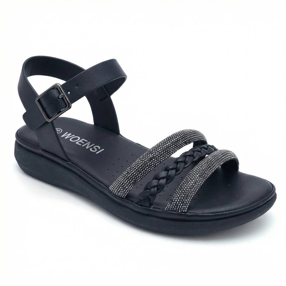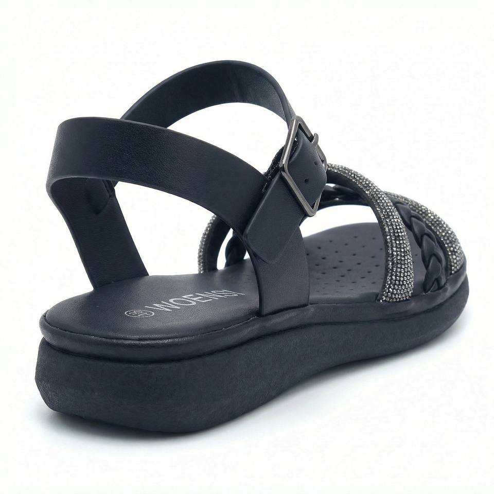 Sandales noires tressées à strass pour femmes, avec bride de cheville réglable, confortables, légères, pour l'été et les occasions décontractées