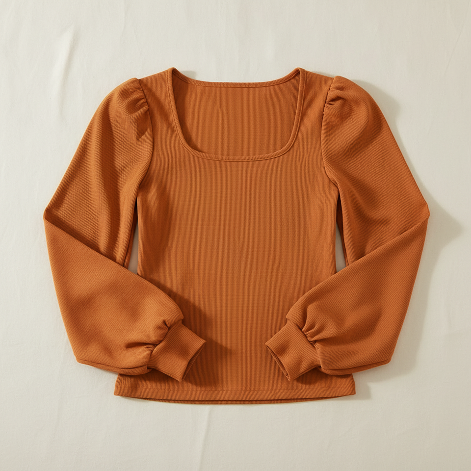 Haut moulant côtelé pour femme à col carré et manches longues, coupe ajustée, avec épaules bouffantes et poignets élastiques, chemisier tendance, style streetwear décontracté, vente en gros