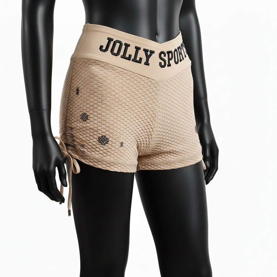 Shorts de sport pour femme, 220 GSM, polyester et élasthanne, maille nid d'abeille beige, taille haute, logo brodé personnalisé.