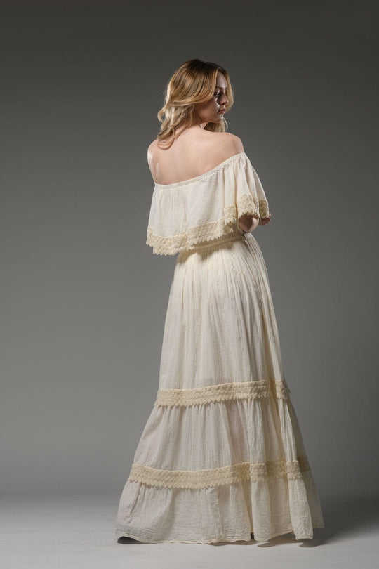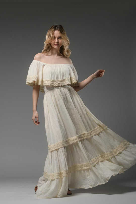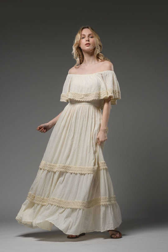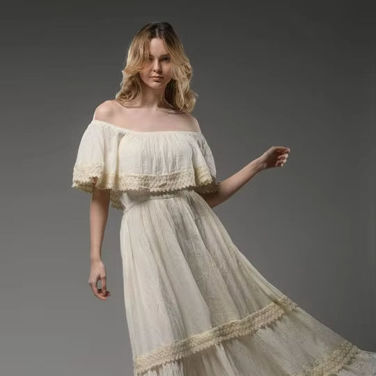 Women Casual Summer Eco-Friendly Knitted 100% Cotton Off-the-Shoulder Maxi Dress Solid Sexy Floral Print Natural Waist Tassel