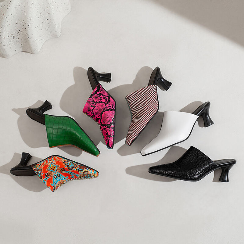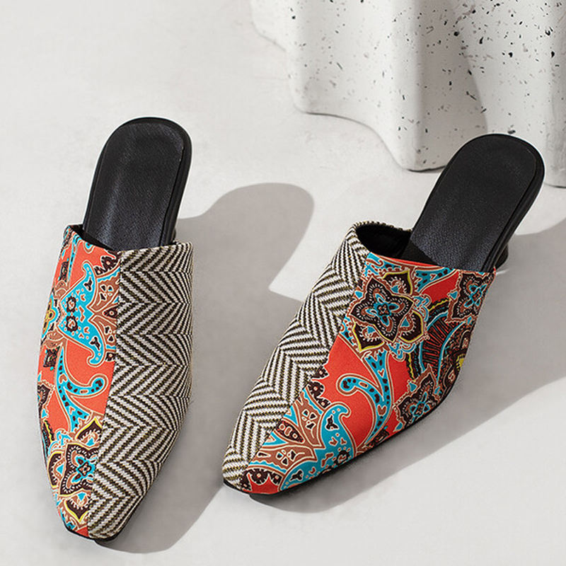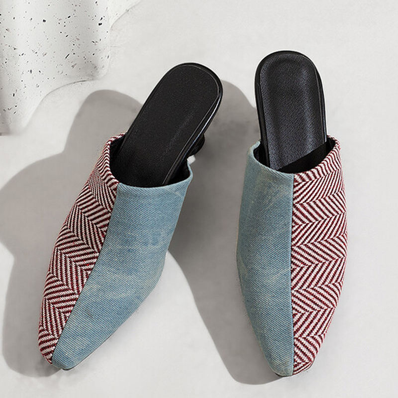 Sandales pour femmes à couleurs mélangées, grande taille 48, sexy, à talons aiguilles bas, bout pointu, style mules patchwork