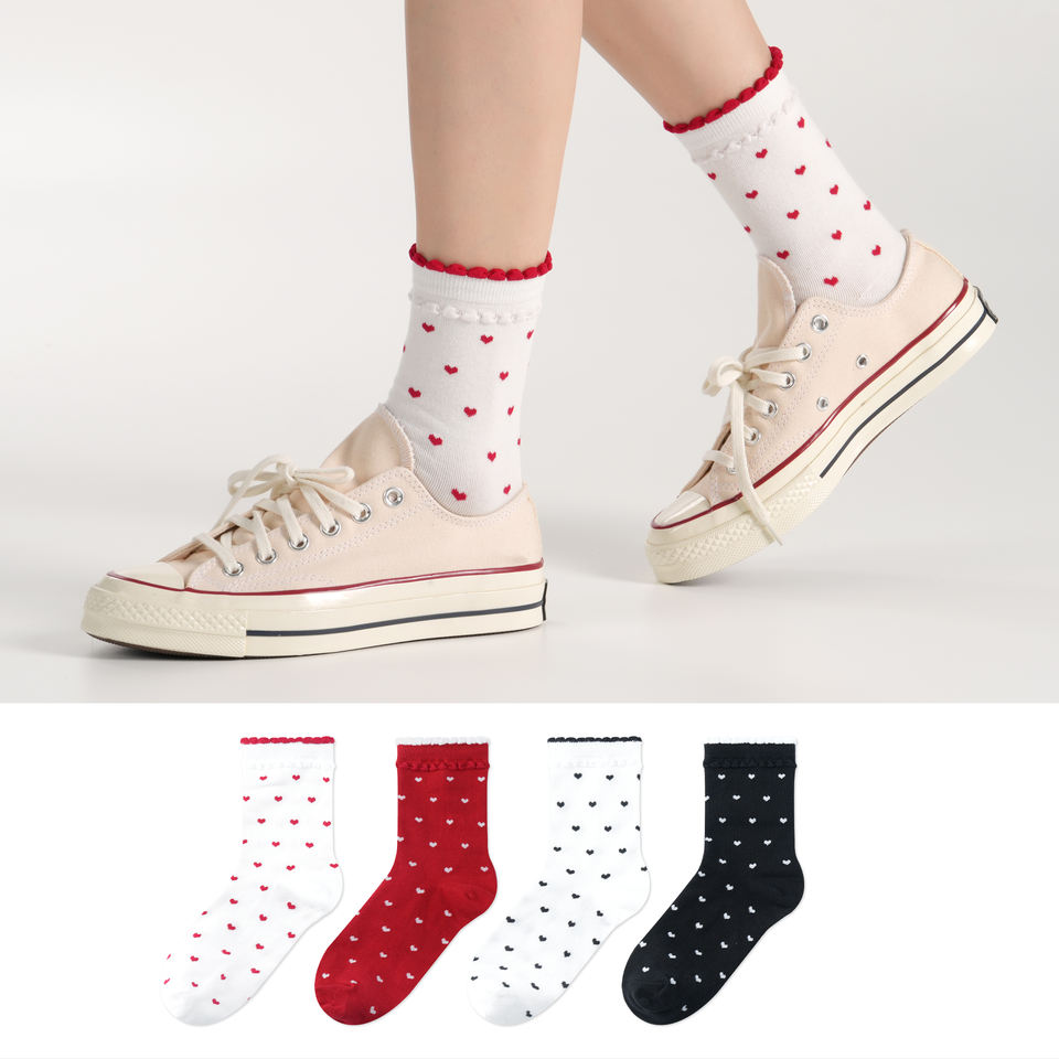 Chaussettes en coton tricoté respirantes pour femmes - Motif cœur rouge blanc noir Design à volants Chaussettes coréennes à usage quotidien