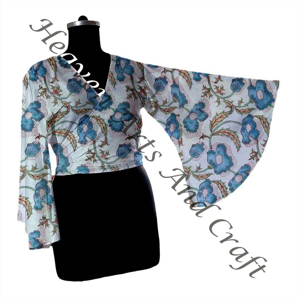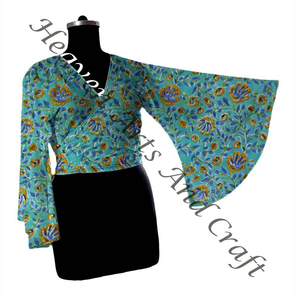 Women Cotton Tie Top Indian Cotton Wrap Top Handmade Boho Hippie Front Tie Summer Top Bell Sleeve Top Festival Retro 60s 70s