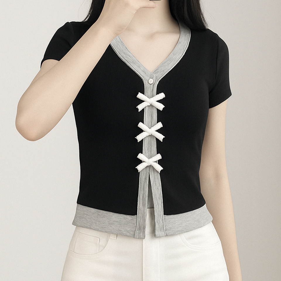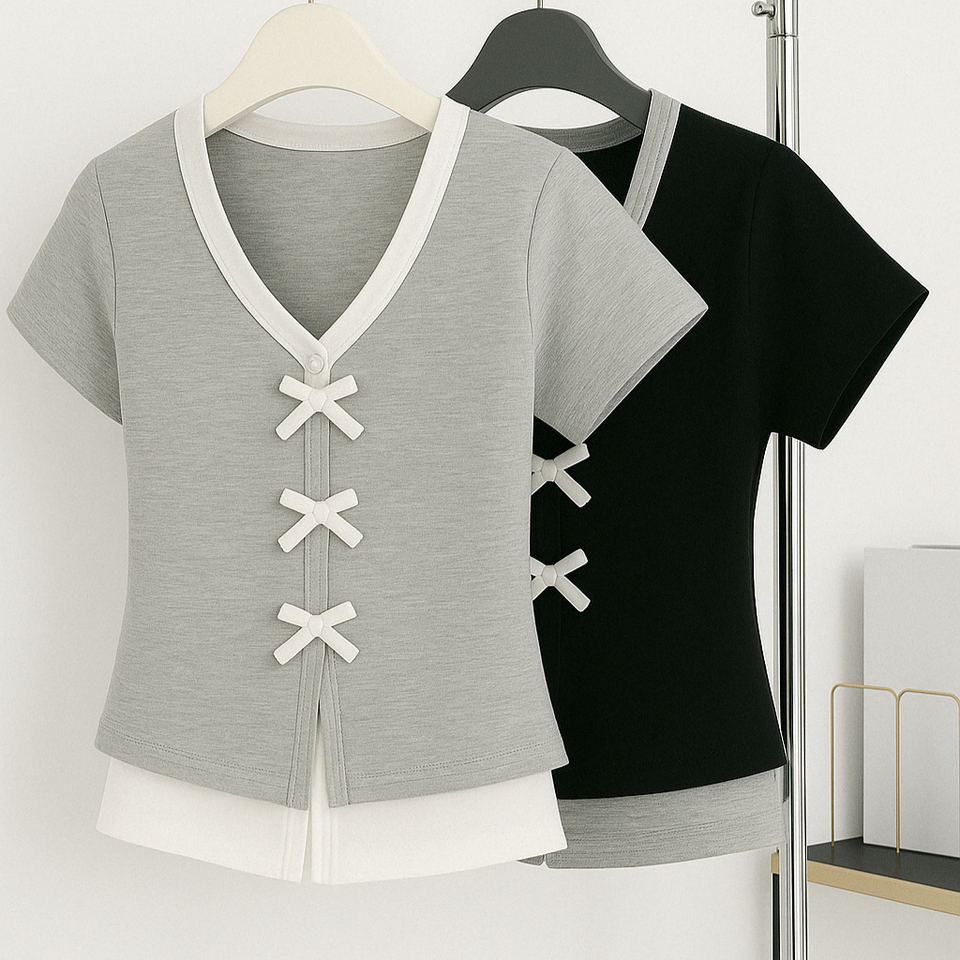 T-shirt en coton respirant pour femme, coupe ajustée, col en V, manches longues avec boutons et nœud, logo personnalisé, tendance estivale