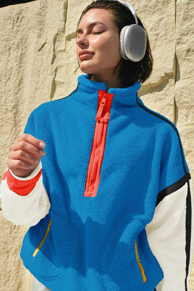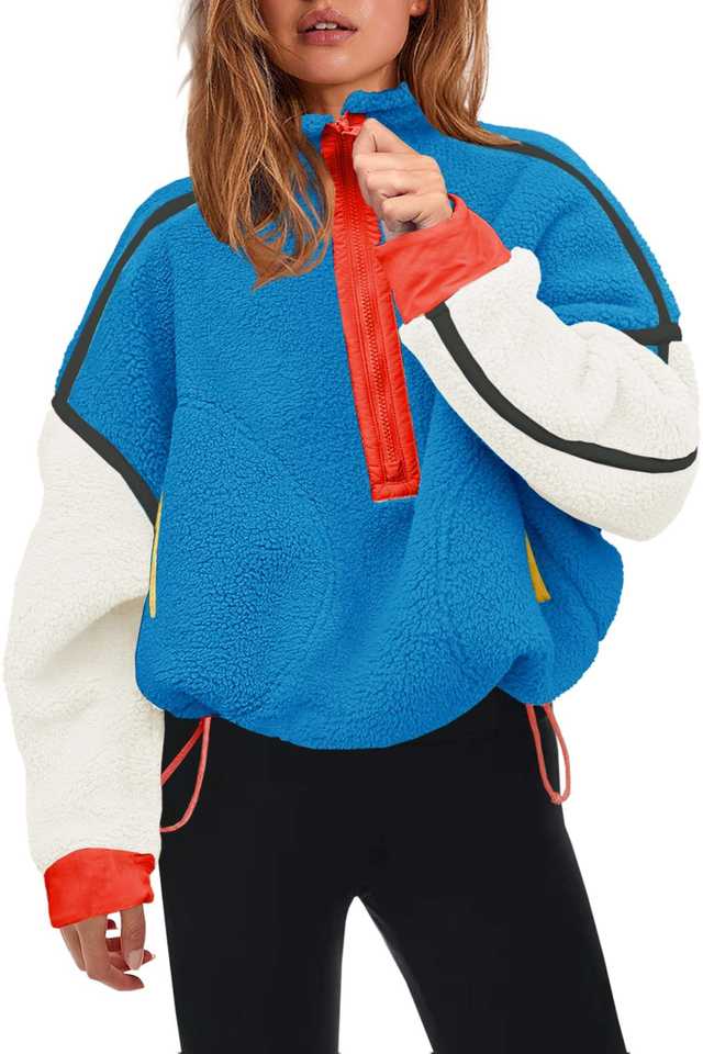 Women Custom Printed Hooded Sherpa Fleece Quarter Zip Sweatshirt Soft Warm Pullover Long Sleeve Color Block Cozy Casual Front
