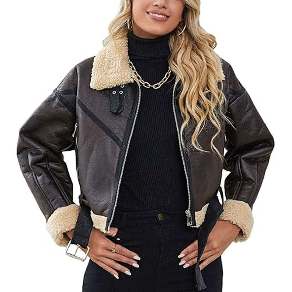 Women Faux Lamb Fur Leather Short Jacket Lapel Zipper Bomber Aviator Coat Warm Outerwear Fashionable Casual Flight Jacket