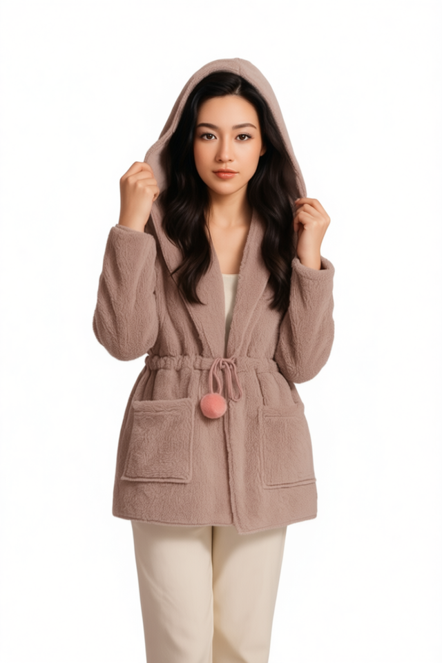 Robe à capuche en polaire pour femme, manches longues, longueur genou, avec cordon de serrage, douce et confortable, vêtement de nuit d'hiver, couleur unie, tricotée, style manteau