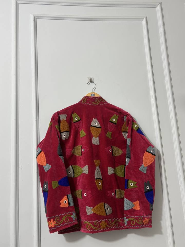 Blouson Bomber Femme Tricoté Main en Velours avec Broderie Poisson, Design Artistique Folklorique Coloré, Style Ethnique Bohème, Hiver Respirant