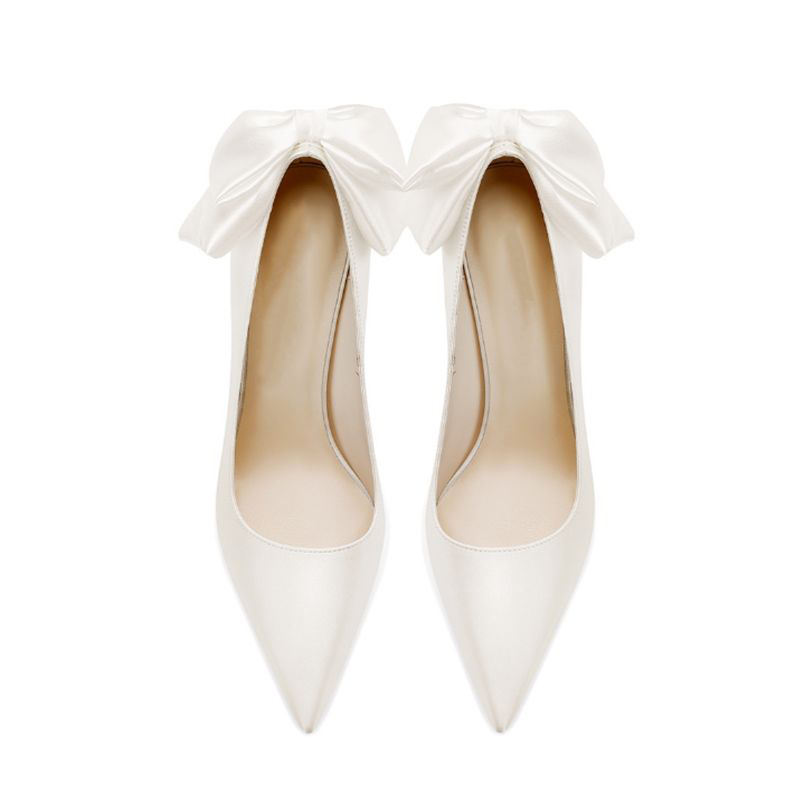Escarpins élégants pour femmes en cuir verni ivoire à bout pointu, talon aiguille, avec nœud arrière, pour mariages, galas, dîners et rendez-vous, vente en gros
