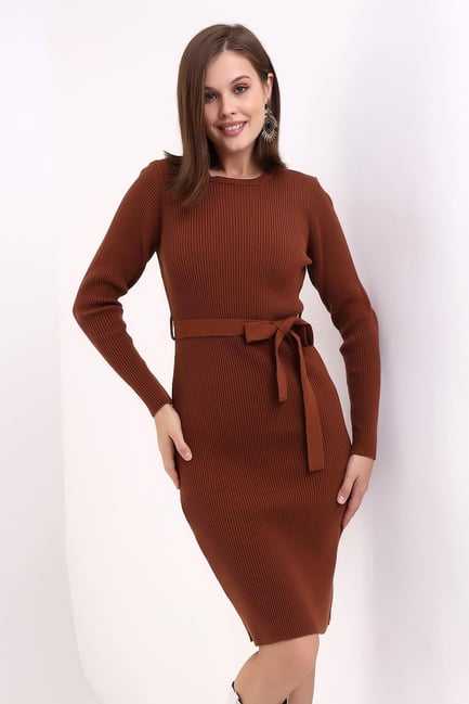 Women Knitwear Crew Neck Dress Long Sleeve Flexible Warm Belt Detail High Quality Winter New Fashion Customizable OEM Services