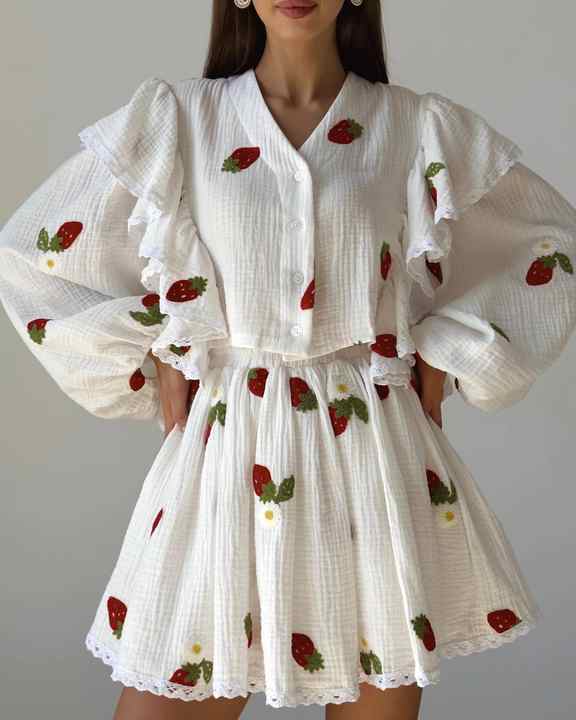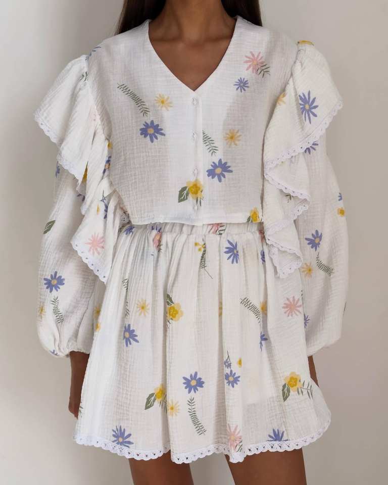 Ensemble jupe et haut pour femmes, haut à manches lanternes à volants, col en V, patchwork, simple boutonnage, jupe courte taille haute, ensemble ample en coton et lin imprimé pour femmes