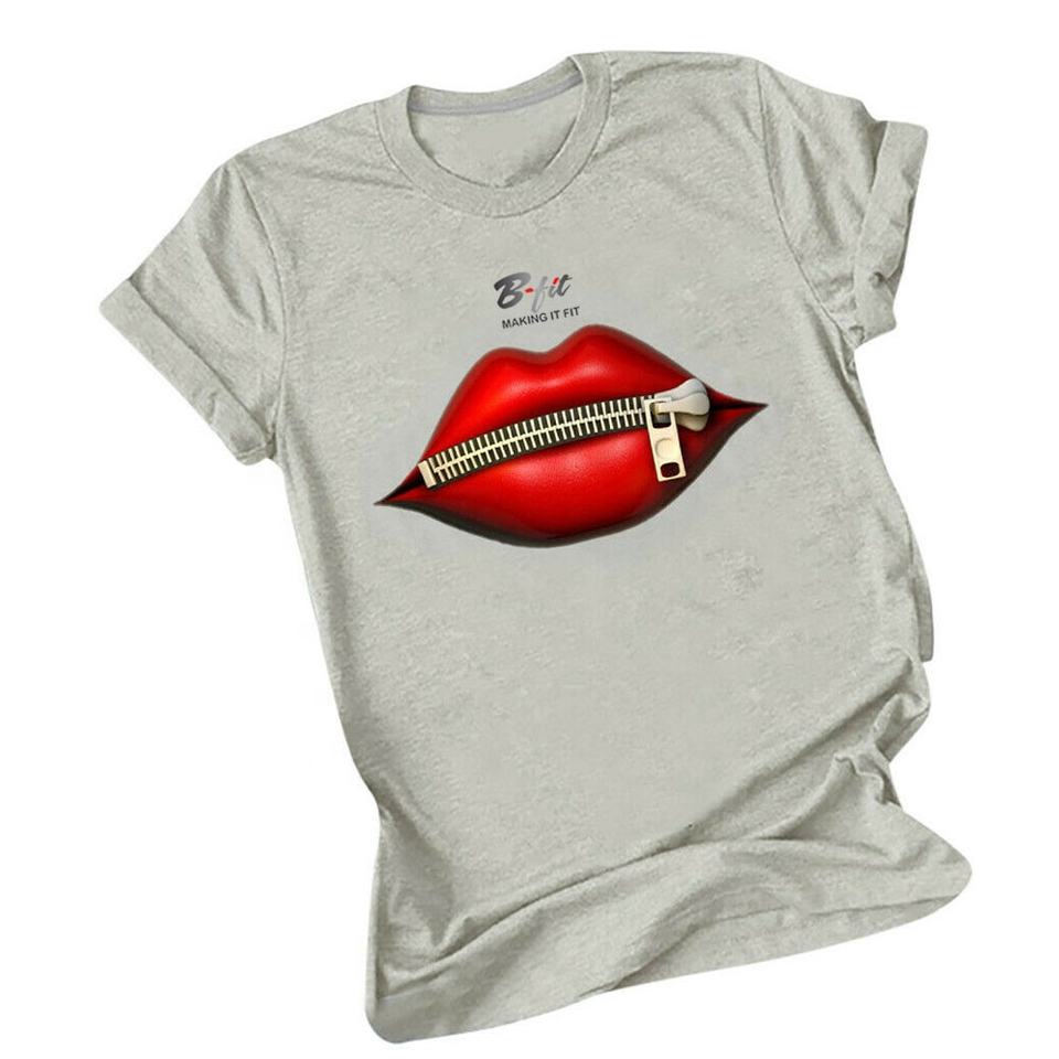 T-shirt manches courtes col rond, pour femme, estival et décontracté, avec lèvres imprimées,