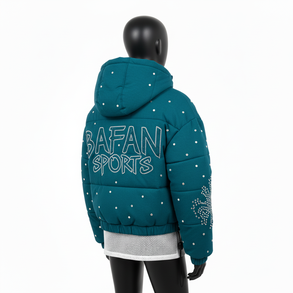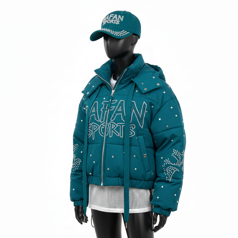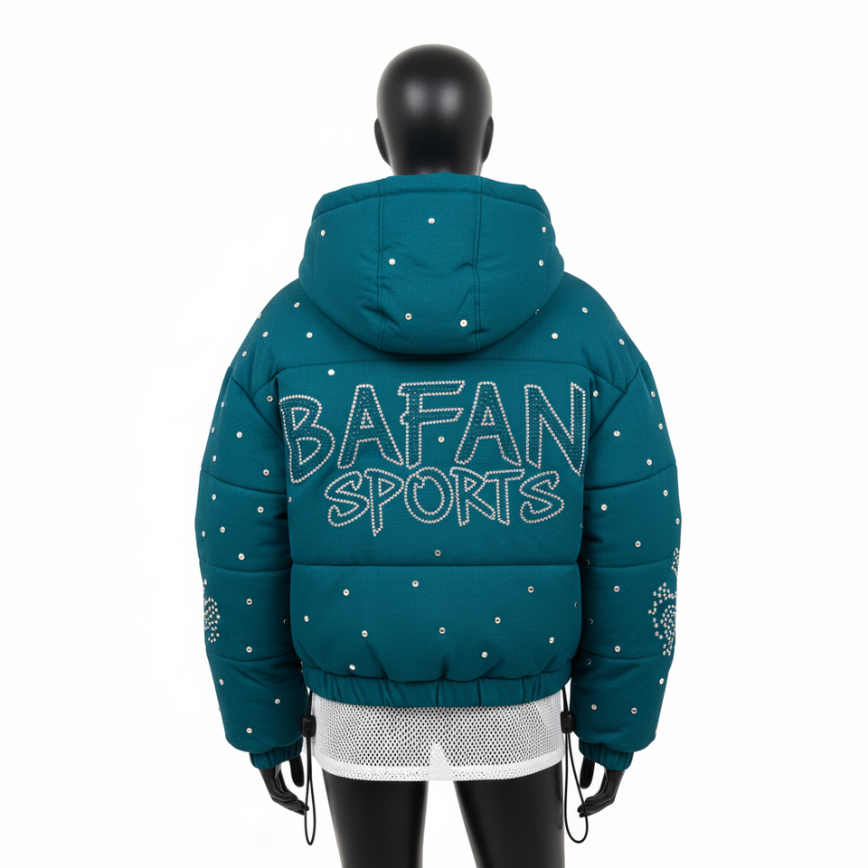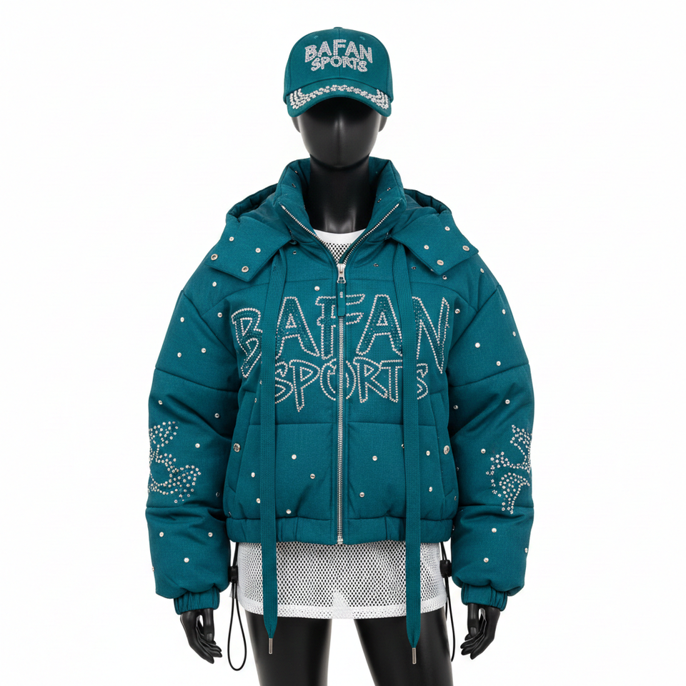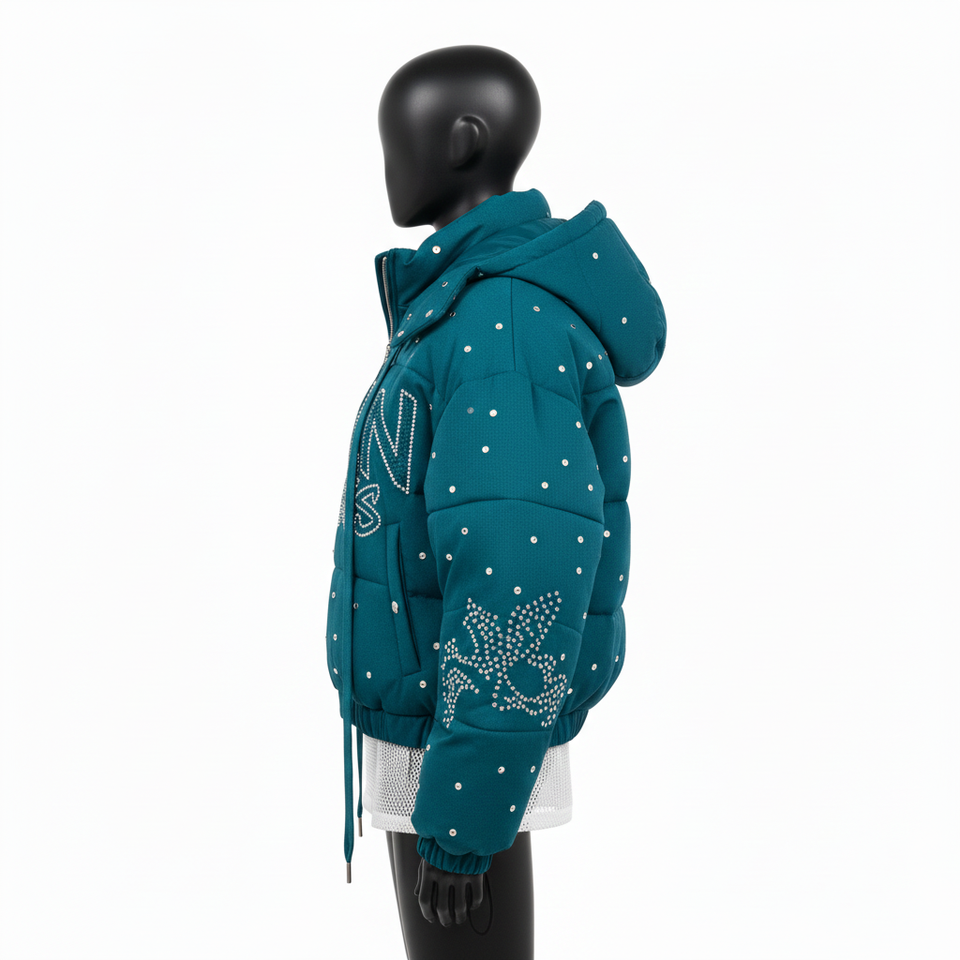 Veste matelassée de luxe pour femmes, tissu en polyester de haute qualité, panneaux matelassés turquoise, strass thermocollés, logo personnalisé, veste matelassée pour femmes