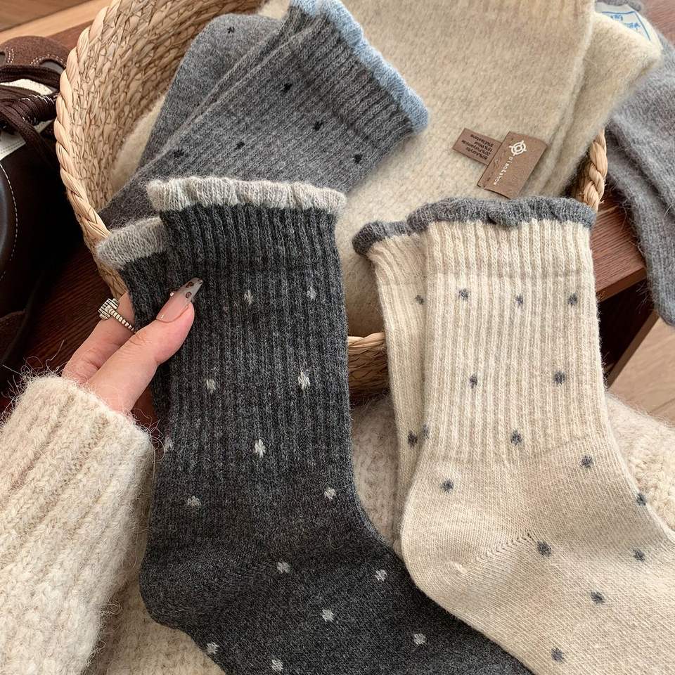 Women Mid Calf Socks Solid Color Polka Dots Thermo Winter Casual Socks