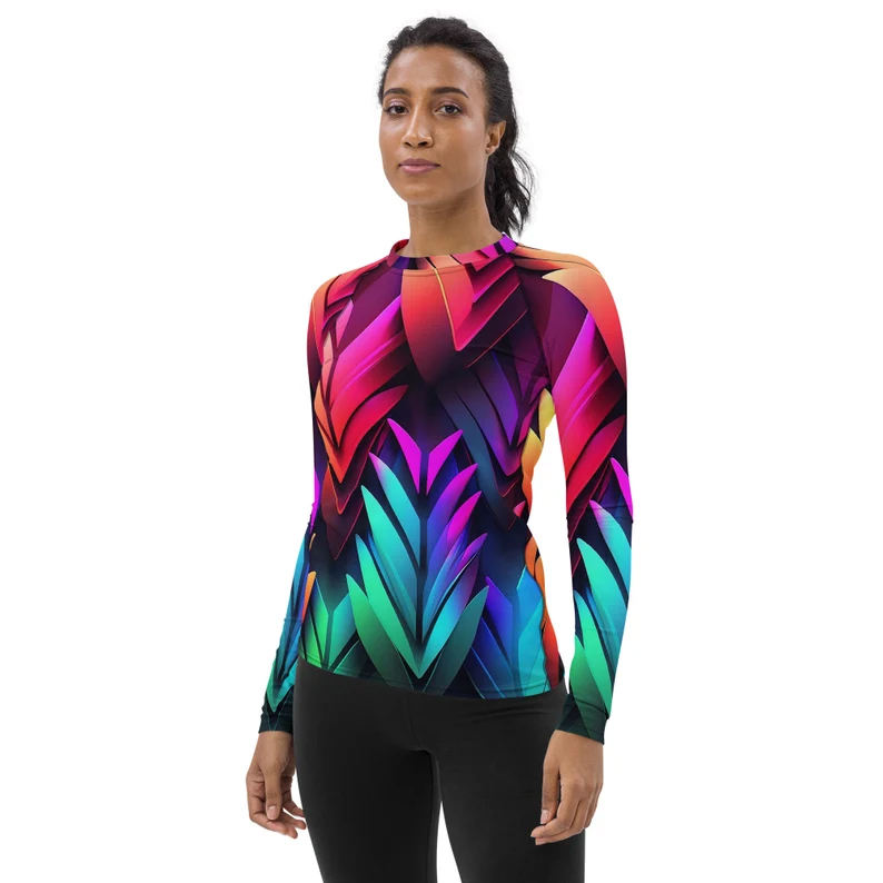 Top vente femmes Spandex Nylon Rash Guard chemises Sublimation personnalisée imprimé partout col rond manches longues Rash Guards vente