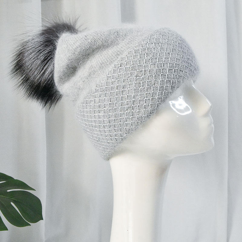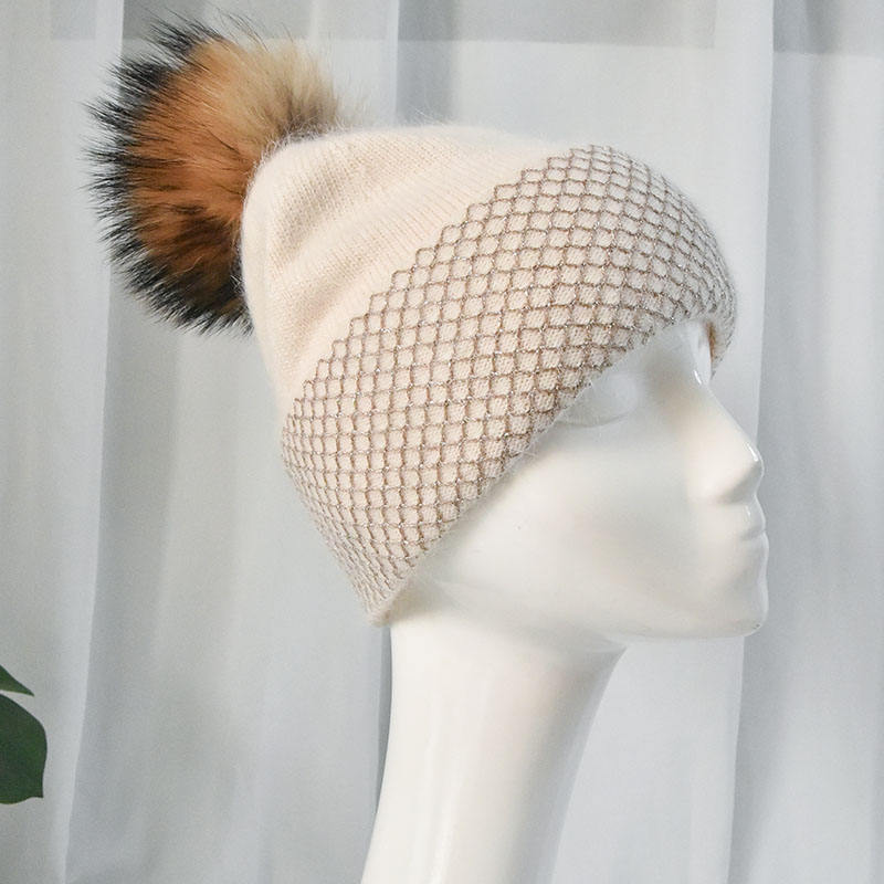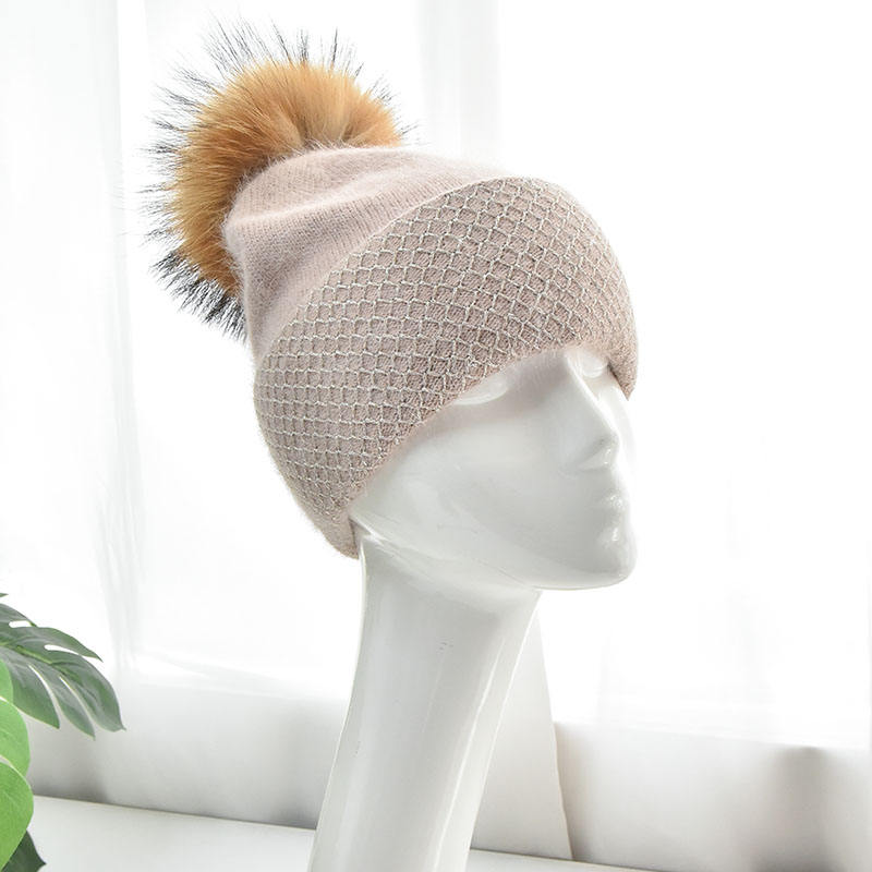 Bonnet tricoté en laine angora avec pompon en fourrure naturelle pour femmes, hiver, double couche, personnalisé, vente en gros