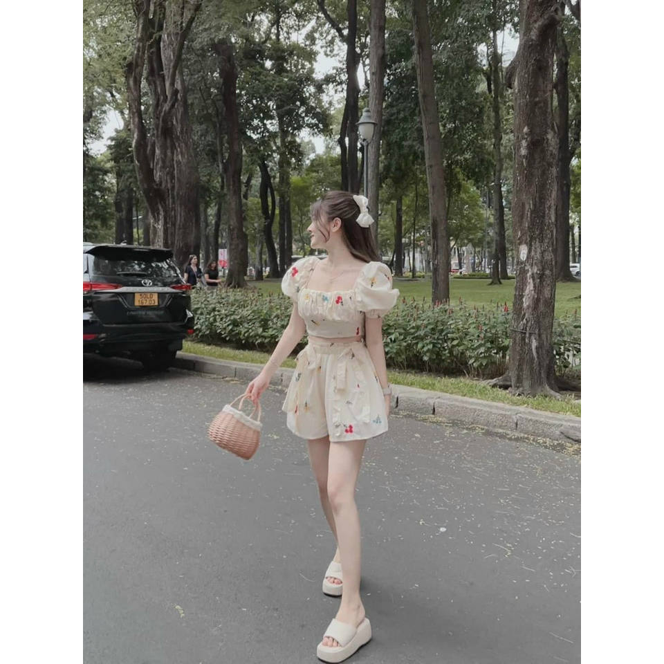 Women Outfits Beautiful Made of 3D Printed Silk Flowers Puffed Sleeves Wide-leg Pants With 2 Bows at the Back of the Pants 2024