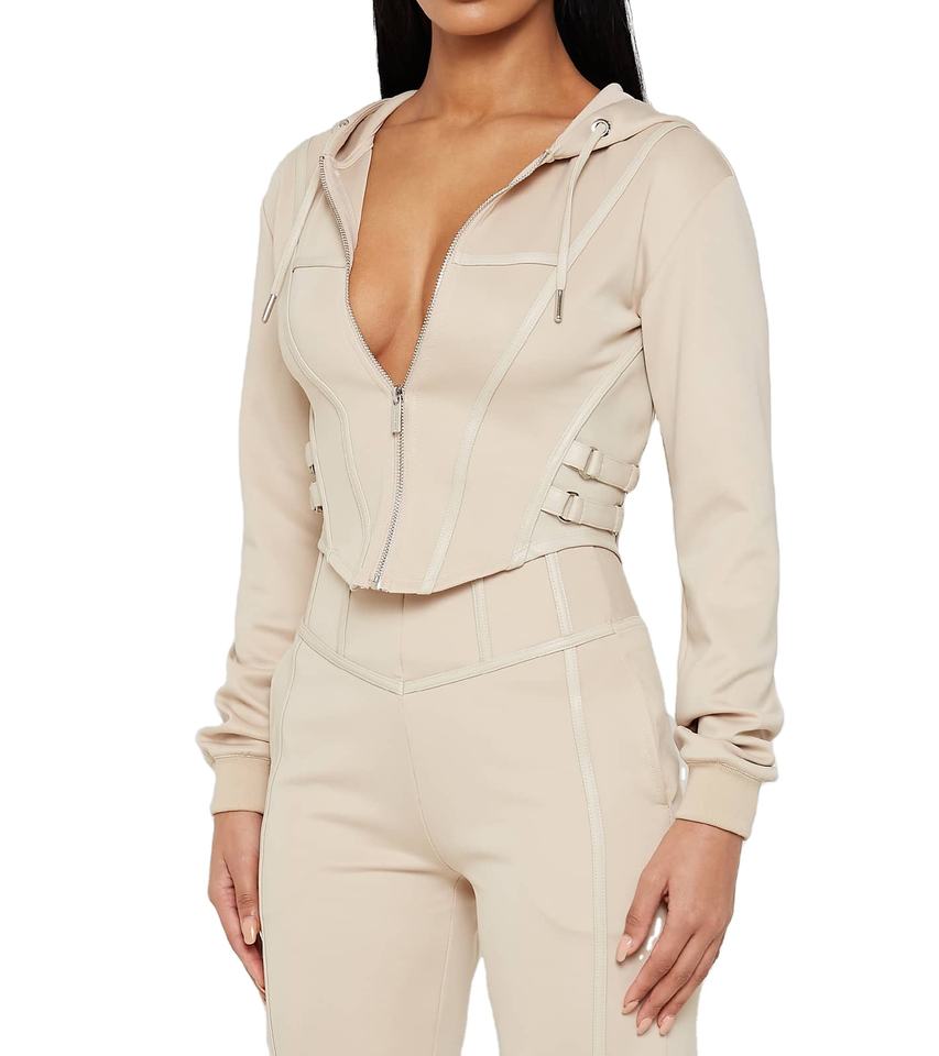 Women Pullover Leather Piping Detail Double Leather Drawcords Corset Cropped Hoodies