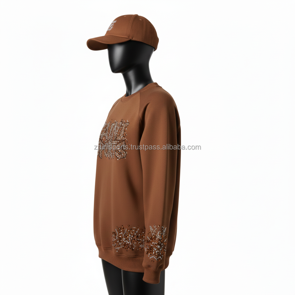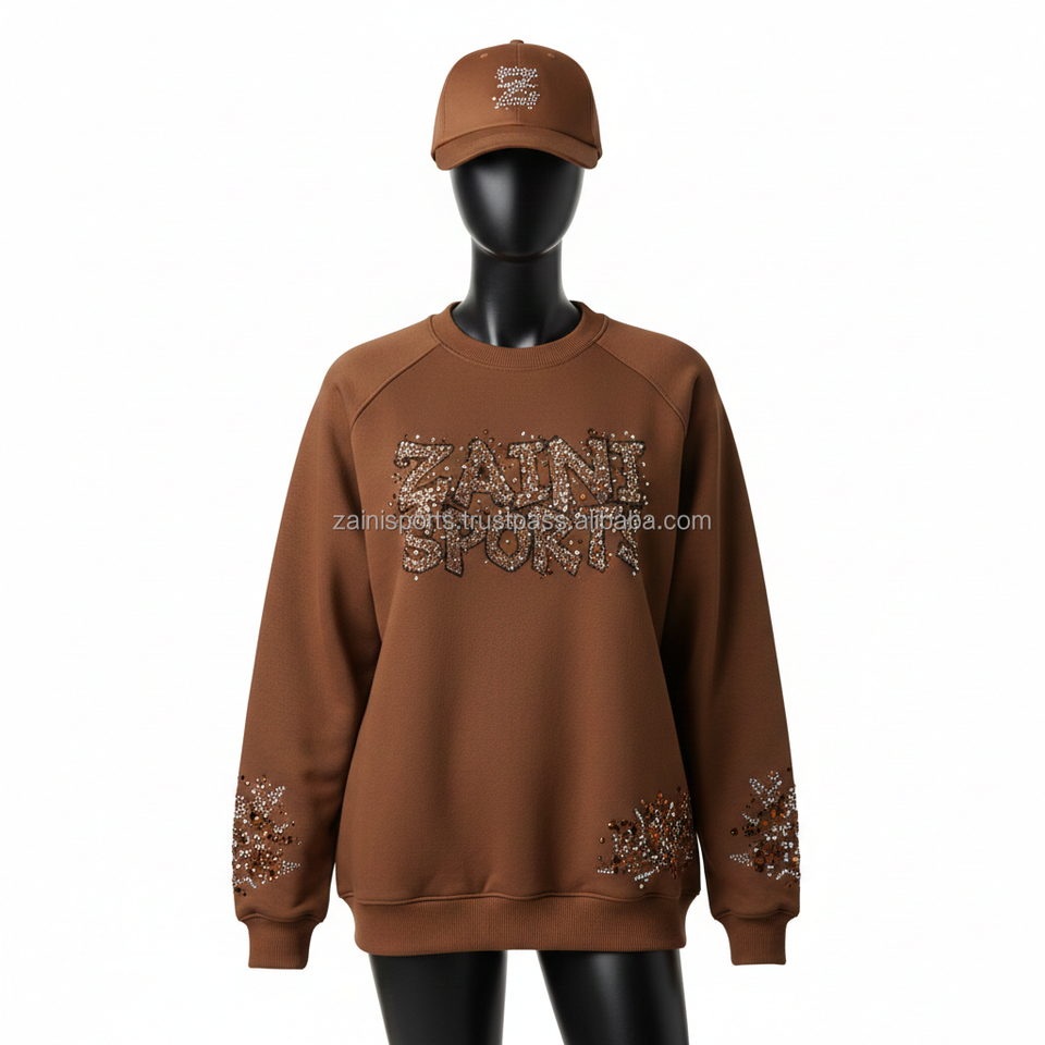 Sweat-shirt pour femme en coton et polyester, marron, manches ornées de strass, logo personnalisé, style respirant pour femme