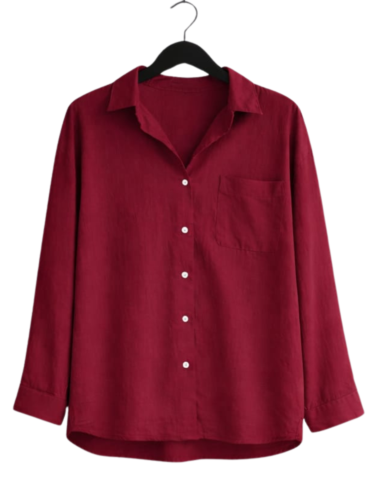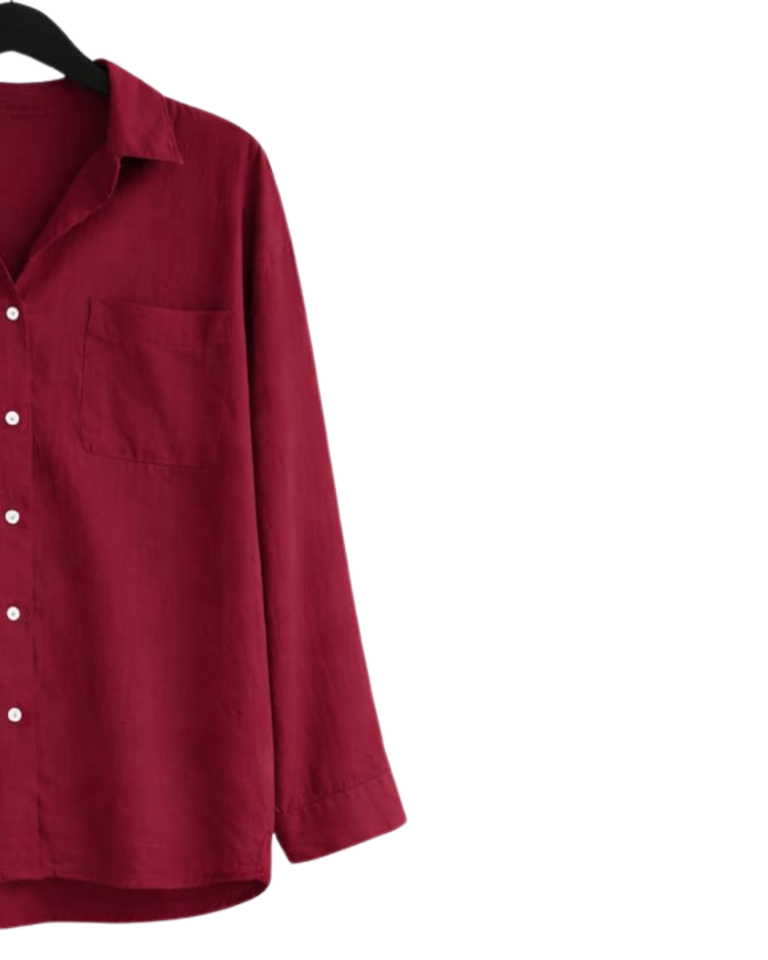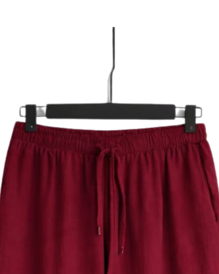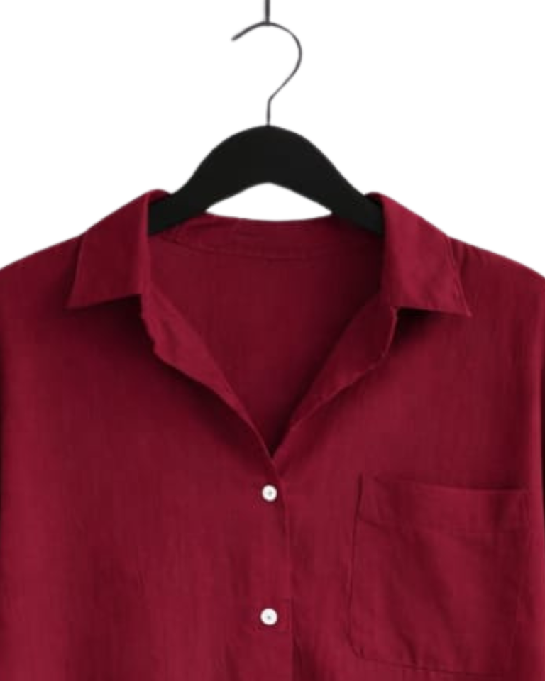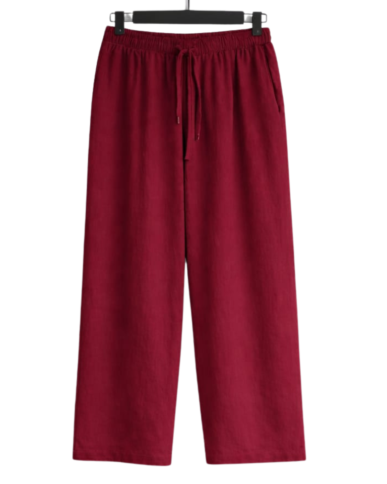 Ensemble deux pièces en lin rouge pour femme, chemise à manches longues boutonnée et pantalon large à taille élastique, tenue décontractée pour la détente