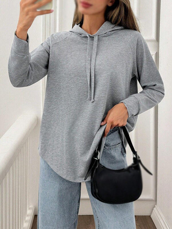 Sweat-shirt à capuche pour femme, longueur standard, cordon de serrage, manches raglan, ourlet incurvé, haut décontracté, gris, vente en gros de sweats à capuche