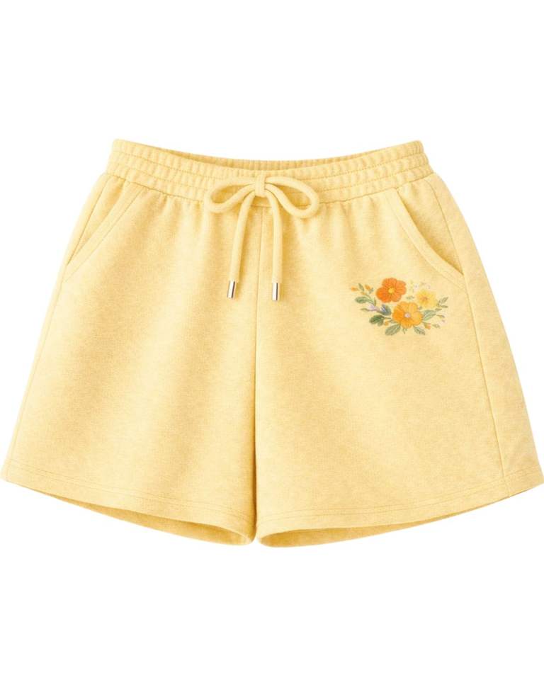 Ensemble décontracté deux pièces pour femme : débardeur court côtelé et short à cordon de serrage, broderie florale jaune douce – Fabricant