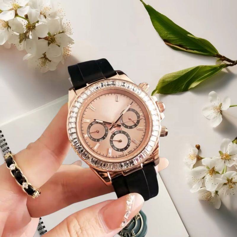 Montre chronographe en or rose et strass pour femmes, bracelet en caoutchouc noir, montre de luxe à diamants pour hommes, montres-bracelets de luxe personnalisées