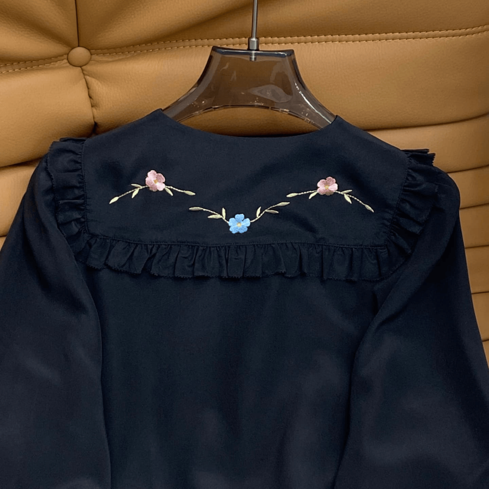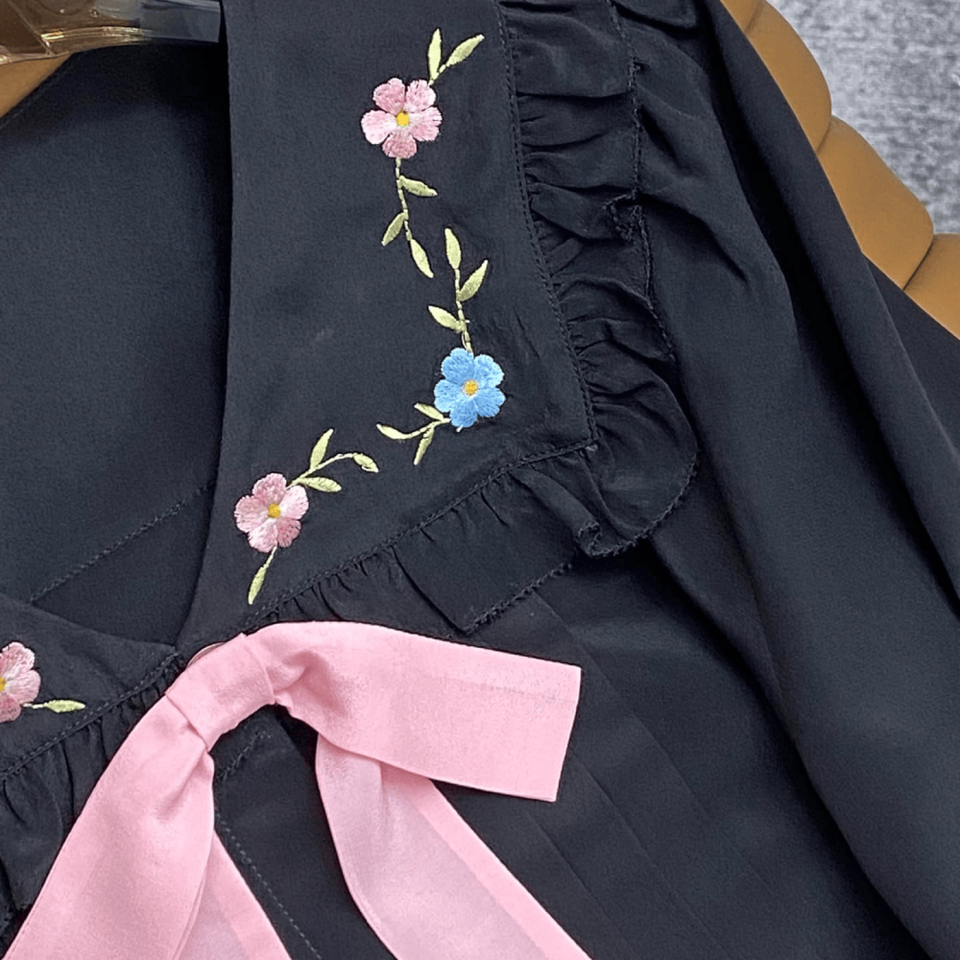 Chemisier brodé à col volanté pour femme, manches longues, avec nœud papillon et boutons, style décontracté