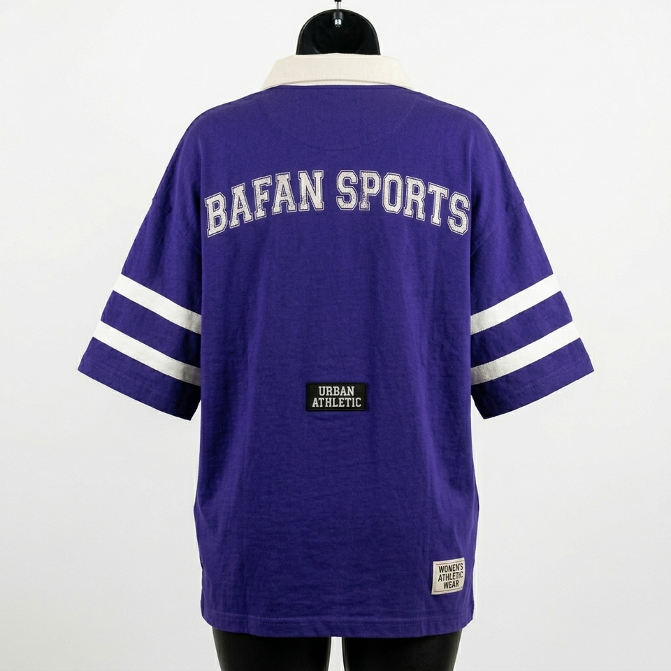 T-shirt de rugby pour femme en jersey coton polyester 250 GSM, avec empiècement poitrine à carreaux violets et logo en twill, en coton