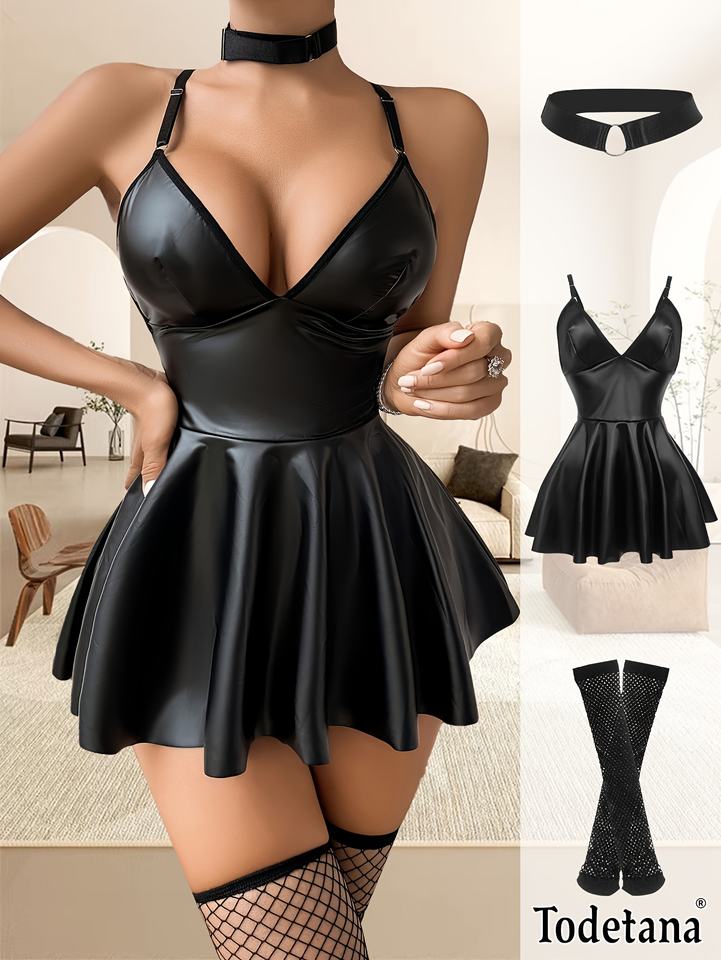 Women'S Black Leather Dress Set Sexy Lady Dress Couple Role Playing Costume Sexy Dress Set with Stockings Neck Set, Lovers