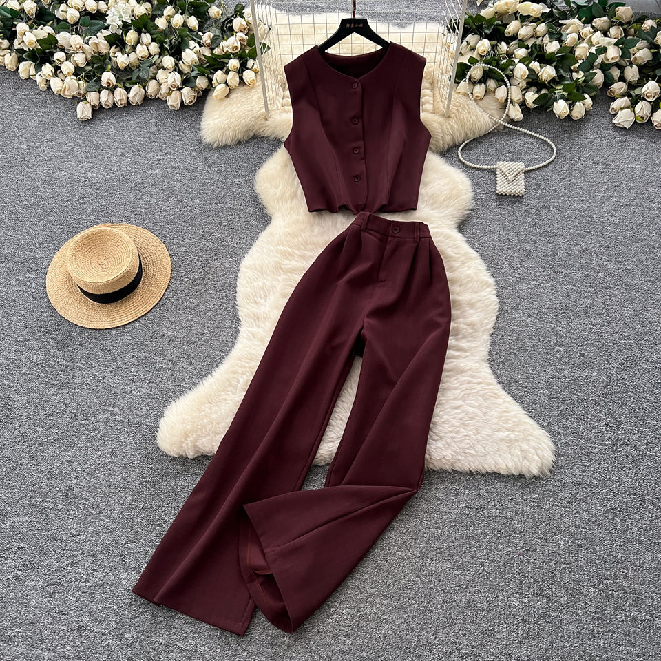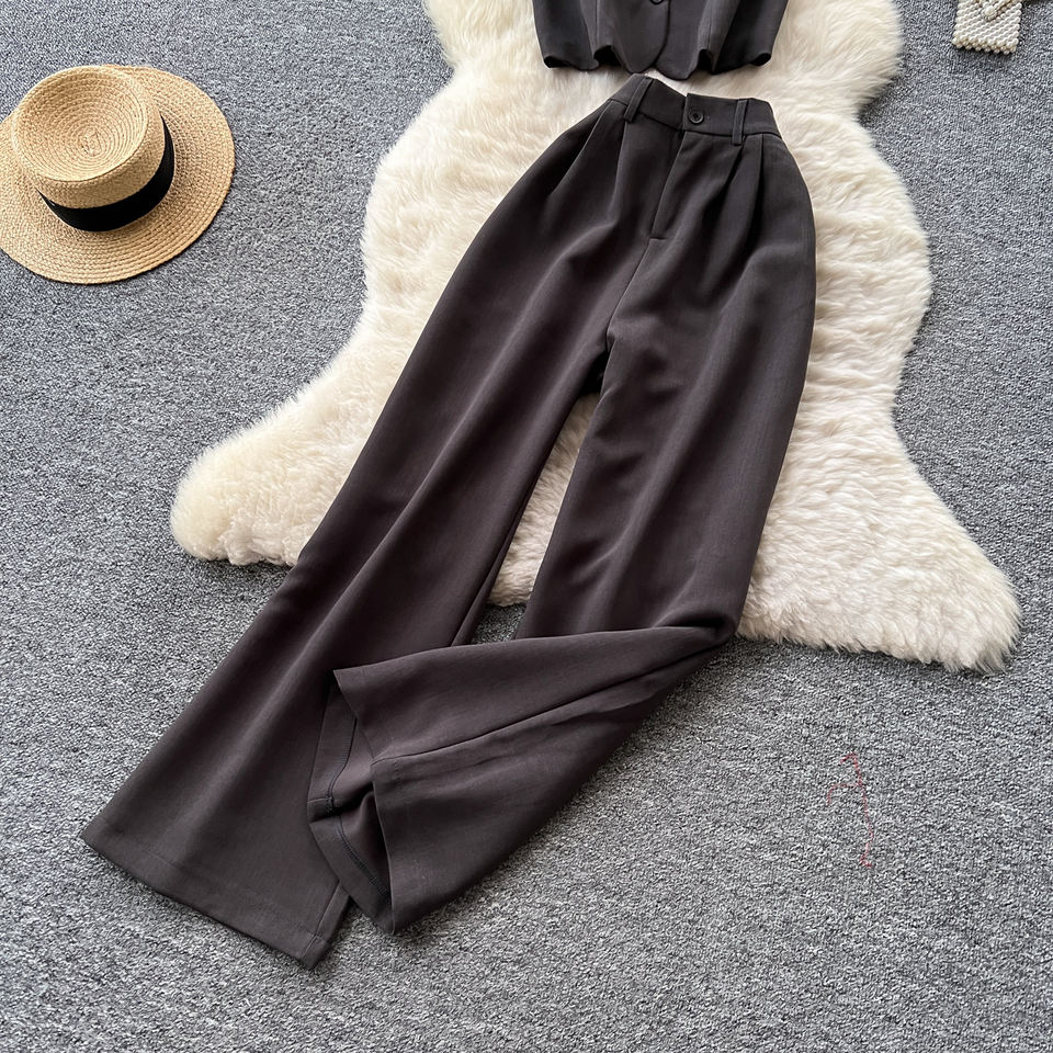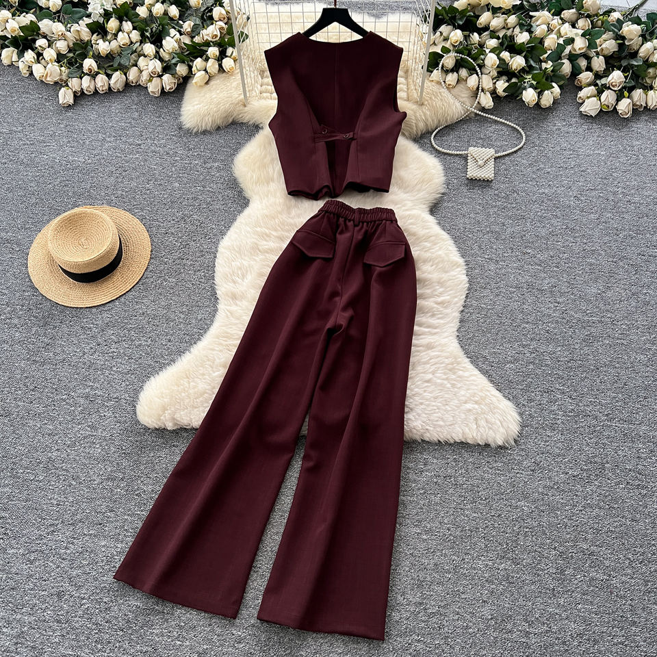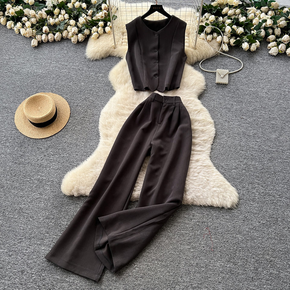 Femmes dames pas cher 2 pièces ensemble rétro automne tenue sans manches gilet avec taille haute pantalon fuselé décontracté Chic deux pièces ensemble