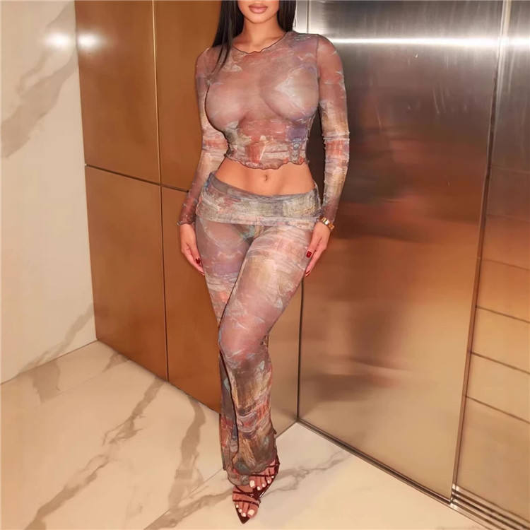 Ensemble 2 pièces transparent pour femmes, haut court imprimé coloré et pantalon à revers, tenue de club ajustée et extensible